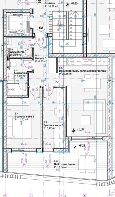 Stambena jedinica se sastoji od hodnika, WC-a s vešerajem, kupaonice, dvije spavaće sobe, dnevnog boravka, blagovaonice i kuhinje koji imaju izlaz na natkrivenu terasu veličine 20 metara kvadratnih.