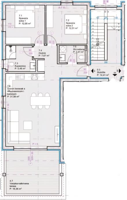 Stan u ponudi se nalazi na prvom katu, na jugo-zapadnoj strani, te je stambene površine veličine 72 metra kvadratna + terasa.
