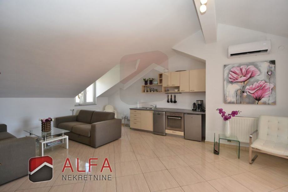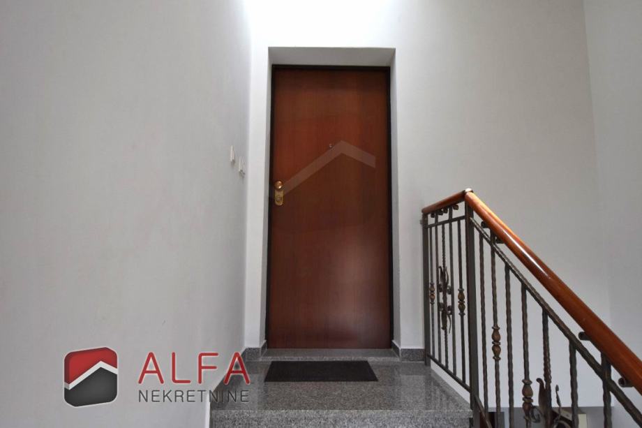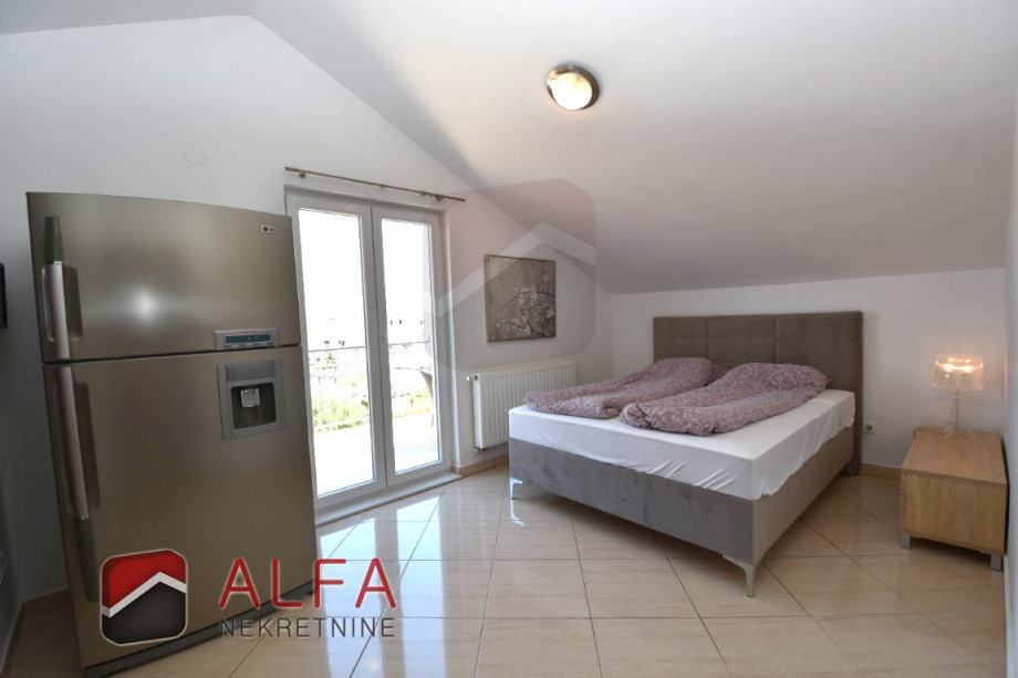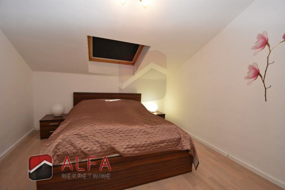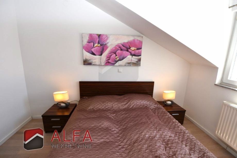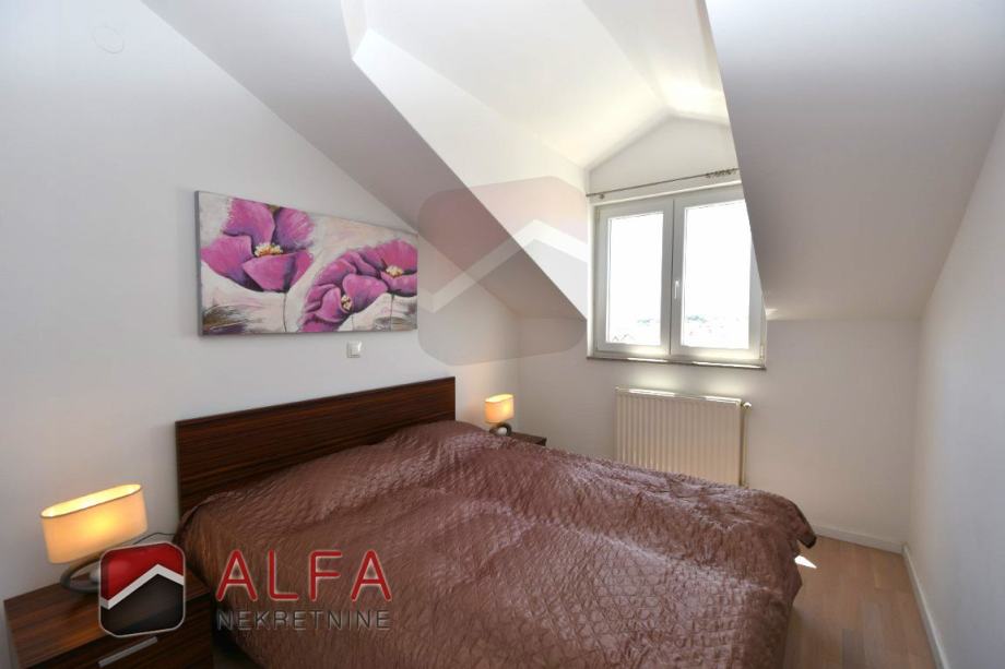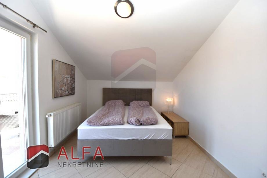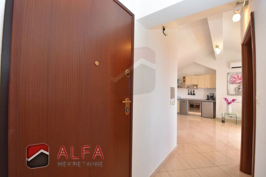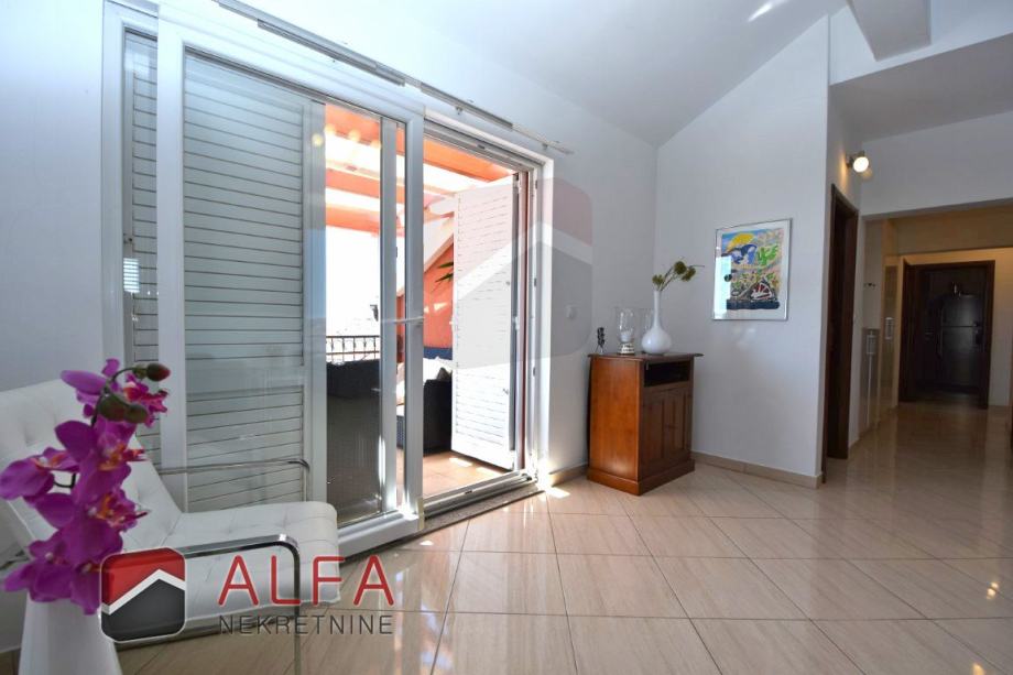 Vrlo je svijetao i prozračan i ima zanimljiv raspored prostorija. Na zapadnoj strani su tri spavaće sobe, od kojih dvije imaju svoju vlastitu garderobu te jedna ima i svoj prostrani balkon. Sve je povezano hodnikom prema istočnoj strani gdje se nalazi još jedna kupaonica, kuhinja s dnevnim boravkom i izlazom na lijepu terasu s koje se pruža prekrasan otvoreni pogled na grad i more.