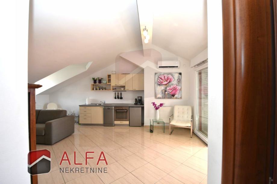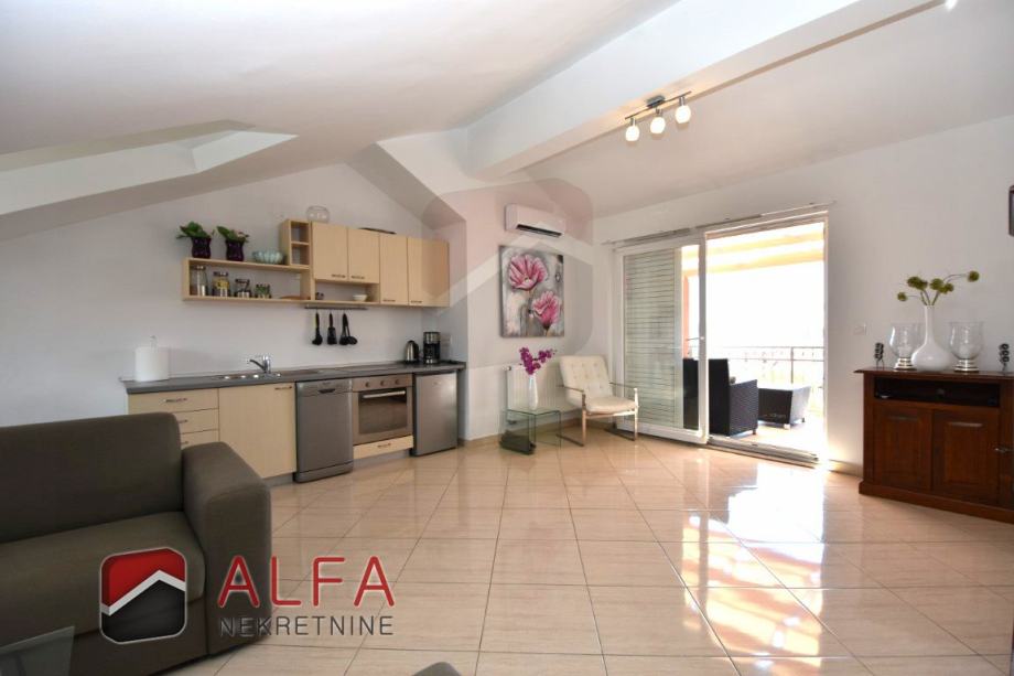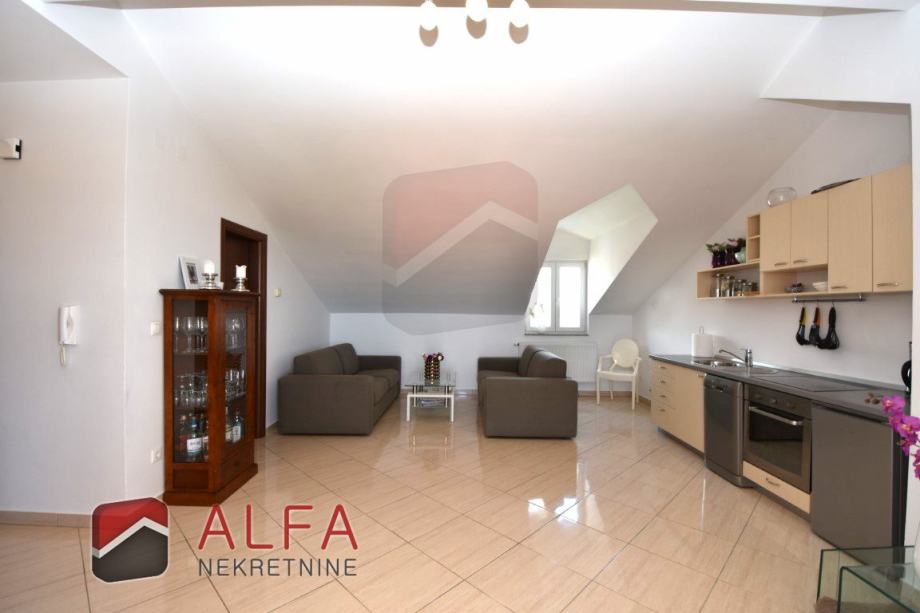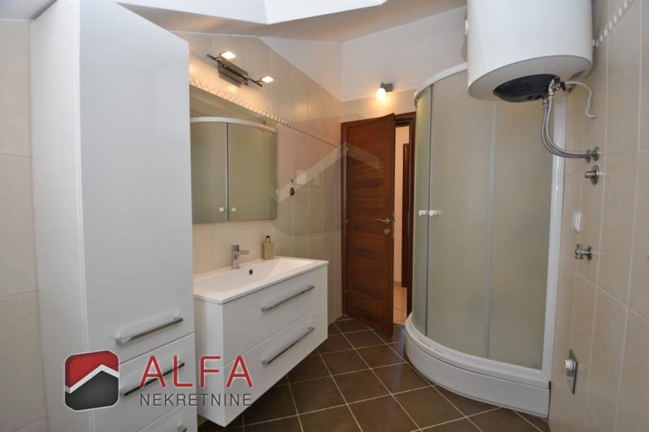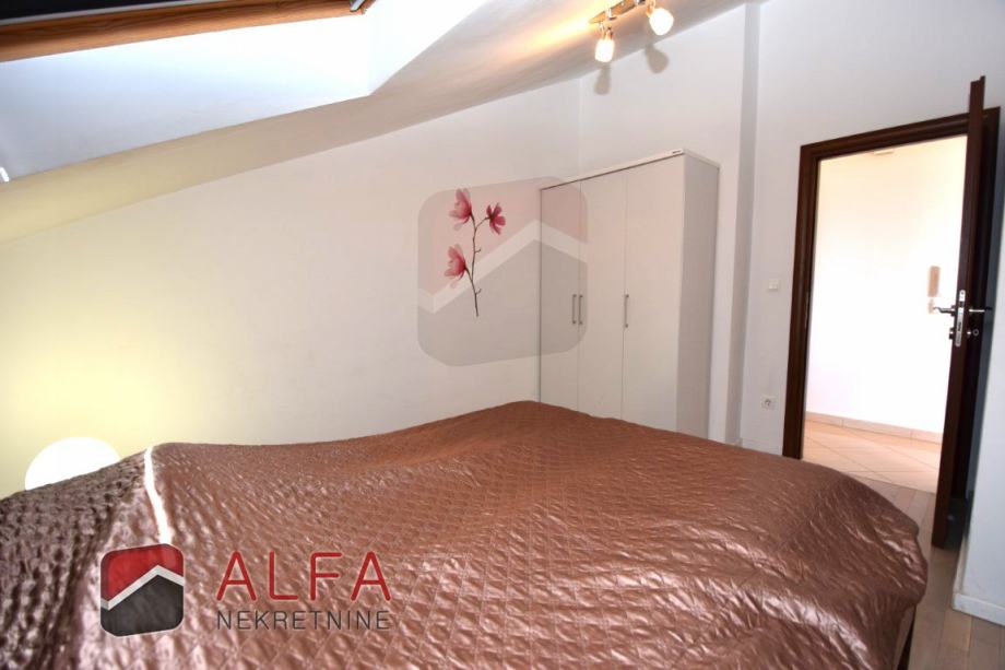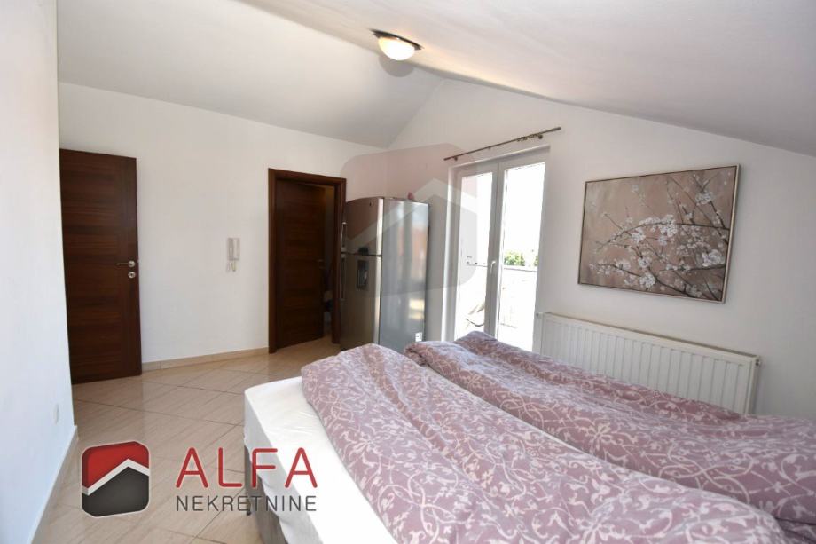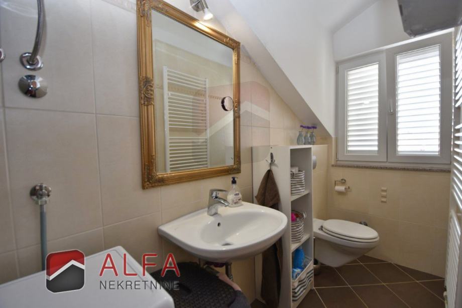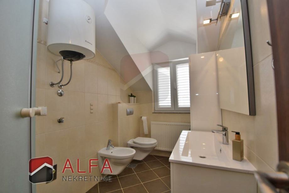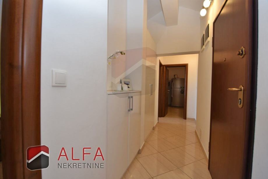 Vrlo je svijetao i prozračan i ima zanimljiv raspored prostorija. Na zapadnoj strani su tri spavaće sobe, od kojih dvije imaju svoju vlastitu garderobu te jedna ima i svoj prostrani balkon. Sve je povezano hodnikom prema istočnoj strani gdje se nalazi još jedna kupaonica, kuhinja s dnevnim boravkom i izlazom na lijepu terasu s koje se pruža prekrasan otvoreni pogled na grad i more.