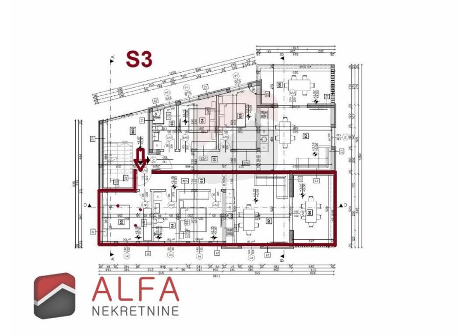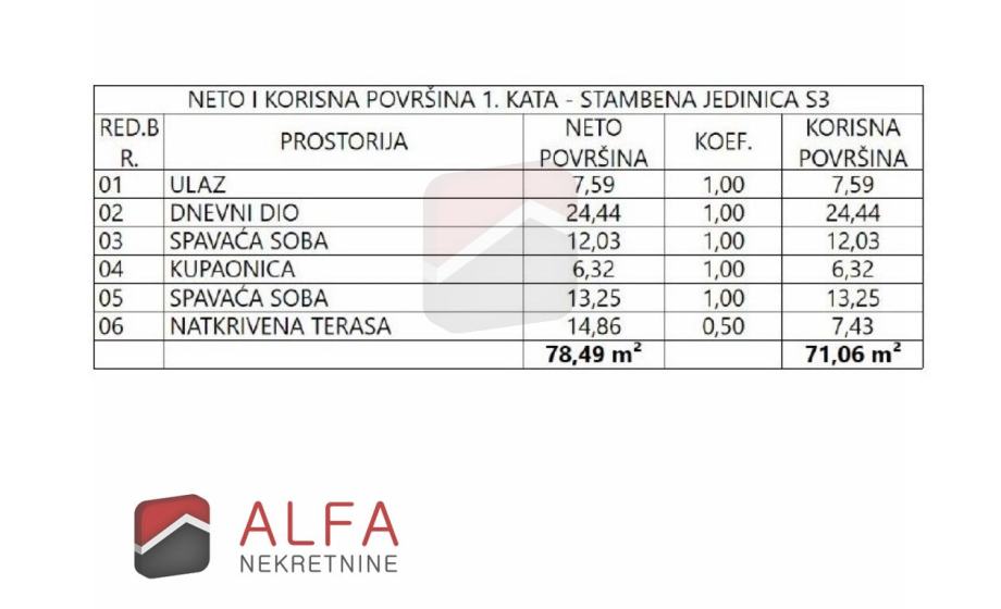 Stan S3 se nalazi na prvom katu i sadržava unutarnji stambeni prostor od 63,63 m2 + natkrivena terasa od 14,86 m2, što sa obračunskim koeficijentima iznosi 71,06 m2 korisne vrijednosti površine. Ovom stanu također u vlasništvo pripada 1 parkirno mjesto od 12 m2 uz mogućnost kupnje dodatnih parkirnih mjesta.