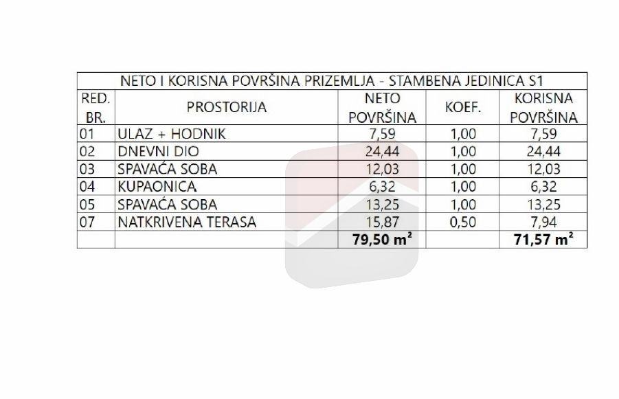 Ovaj stan sadržava unutarnji stambeni prostor od 63,63 m2 + natkrivena terasa od 15,87 m2, što sa obračunskim koeficijentima iznosi 71,57 m2 korisne vrijednosti površine. Ovom stanu također u vlasništvo pripada i vrt od 130 m2 + 1 parkirno mjesto od 12 m2 uz mogućnost kupnje dodatnih parkirnih mjesta.