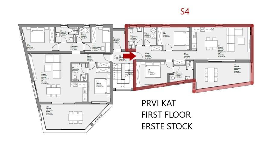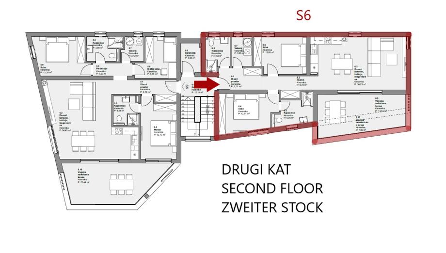 Stan S6 se nalazi na drugom katu manje stambene zgrade koja ima ukupno 6 stambenih jedinica. Stan ima površinu 100,74 m2.