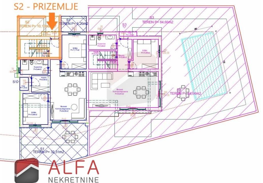 Stan S2 ima svoj vlastiti ulaz neovisan od drugih stanara. Stan se nalazi na prvom katu, ali se njegova površina proteže kroz ulazno prizemlje gdje su stepenice te kroz prvi kat. Ukupna površina je 75 m2 + jedno parkirno mjesto.