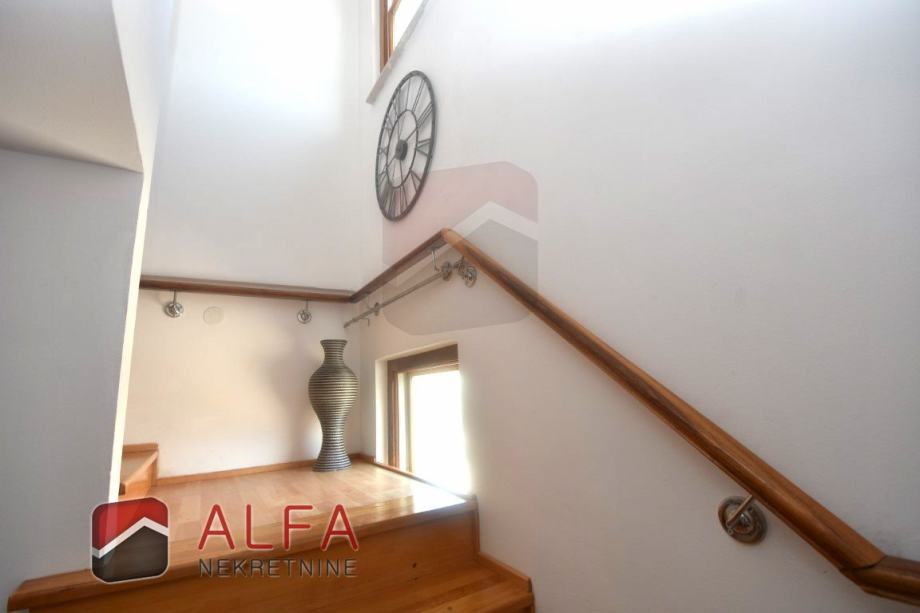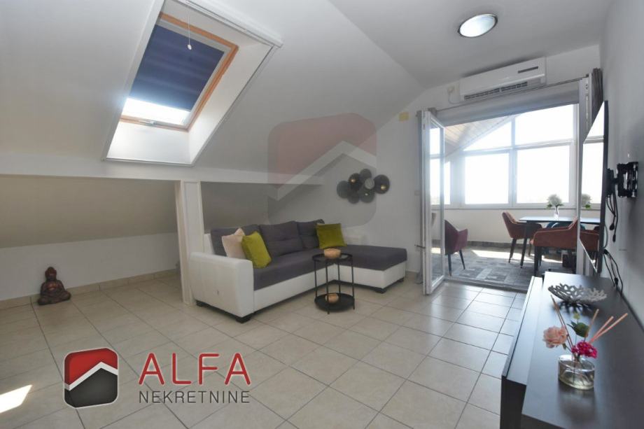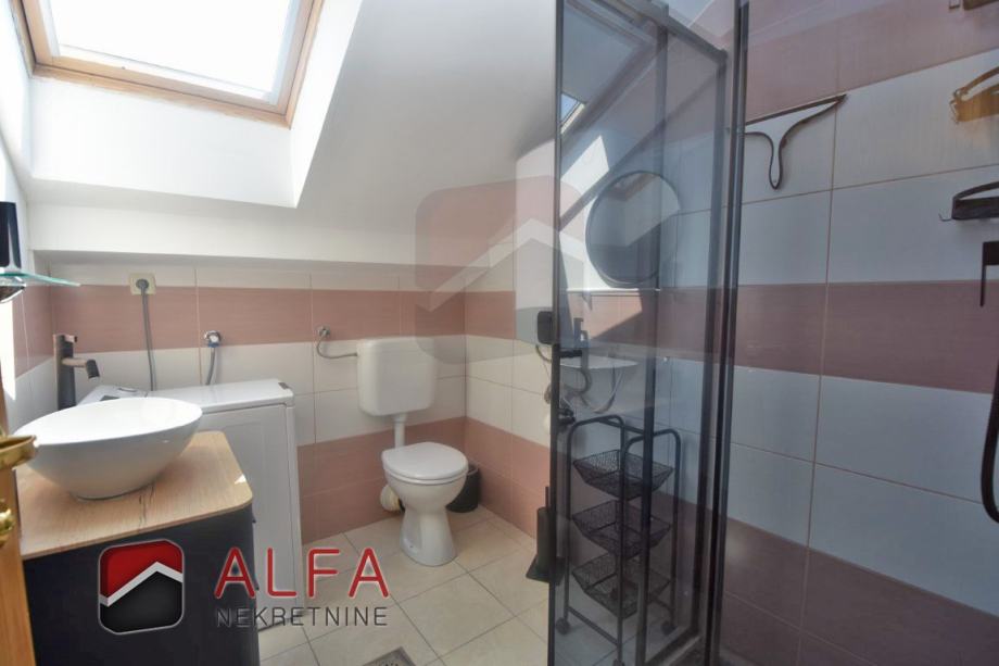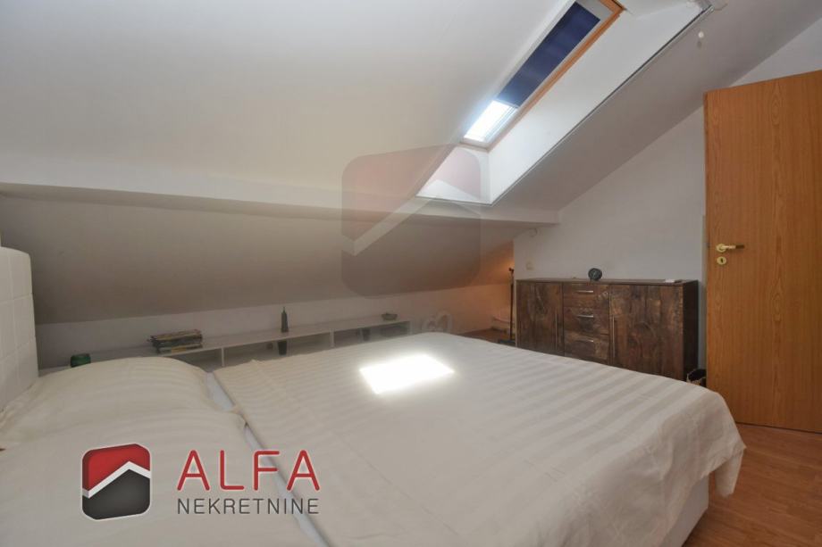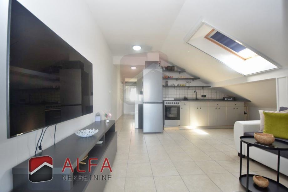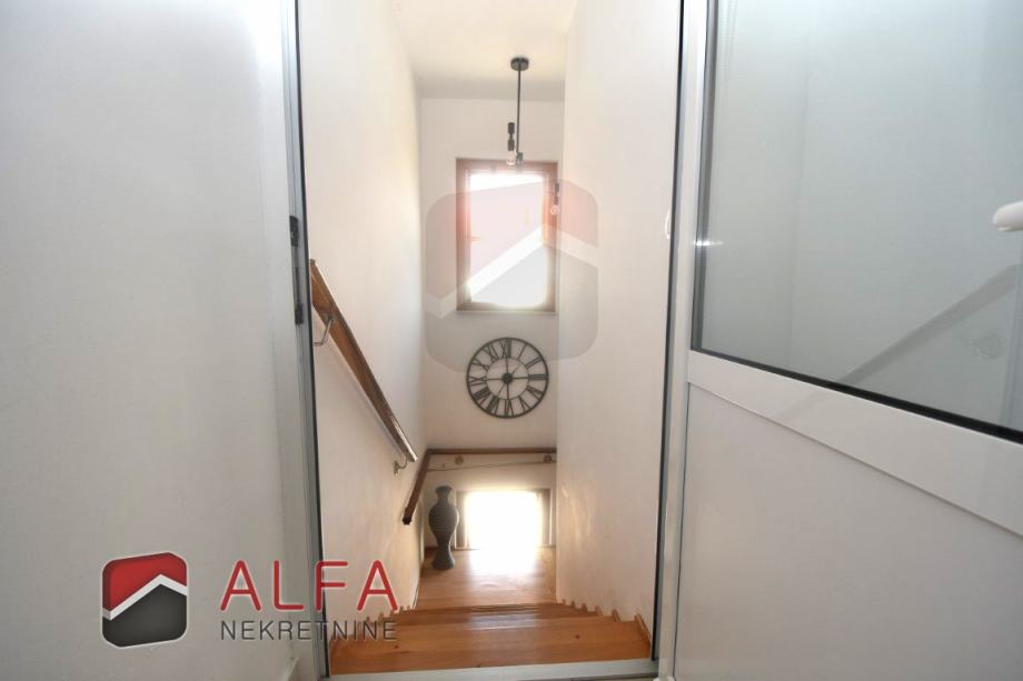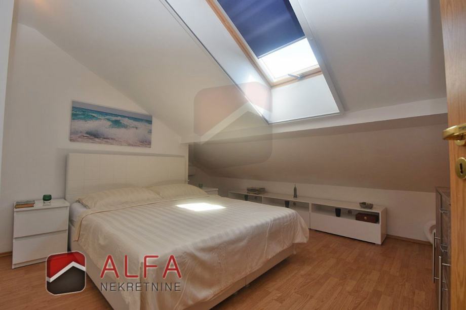 Sastoji se od stepeništa, hodnika, jedne spavaće sobe, kupaonice, kuhinje sa spojenim dnevnim boravkom, te prostrane natkrivene lođe, koja je ostakljena i preuređena u još jednu lijepu prostoriju, sa koje se pruža lijepi pogled na grad i more.