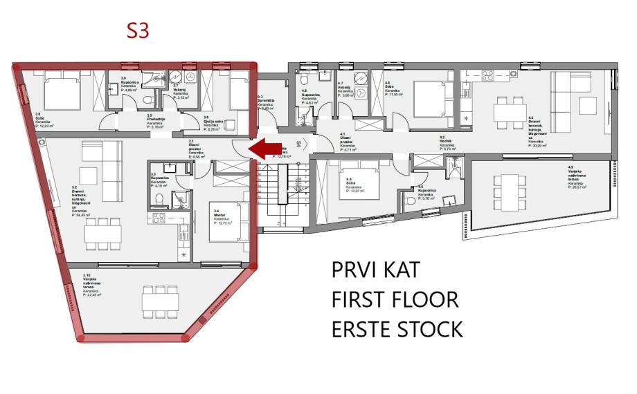 Stan S3 se nalazi na prvom katu manje stambene zgrade koja ima ukupno 6 stambenih jedinica. Stan ima površinu 112,51 m2.
