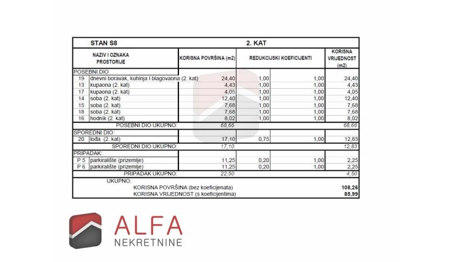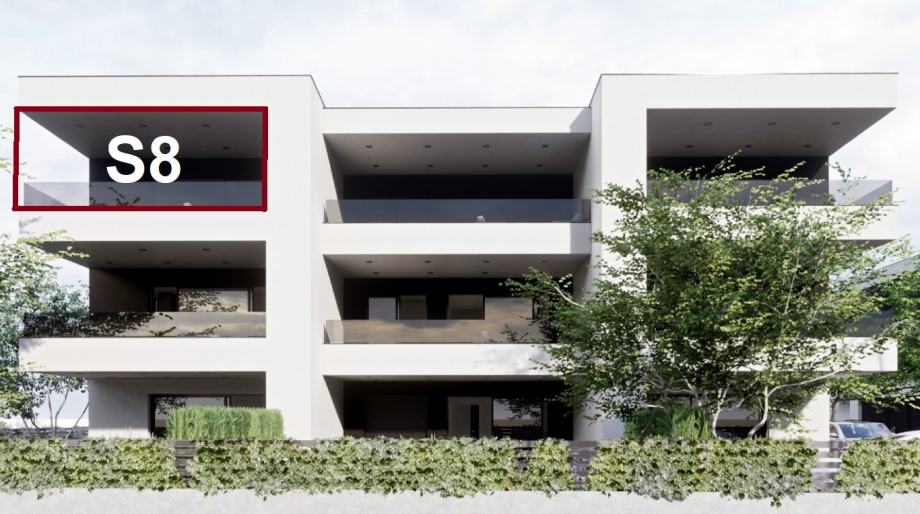 Stan S8 ima unutarnji stambeni prostor od 68,66 m2 + natkrivena terasa 17,10 m2 + dva parkirna mjesta svako od 11,25 m2. Sveukupno sa obračunskim koeficijentima stan ima ukupnu korisnu vrijednost površine od 85,99 m2.