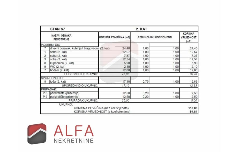 Stan S7 ima unutarnji stambeni prostor od 76,98 m2 + natkrivena terasa 17,10 m2 + dva parkirna mjesta od ukupno 25,00 m2. Sveukupno sa obračunskim koeficijentima stan ima ukupnu korisnu vrijednost površine od 94,81 m2.