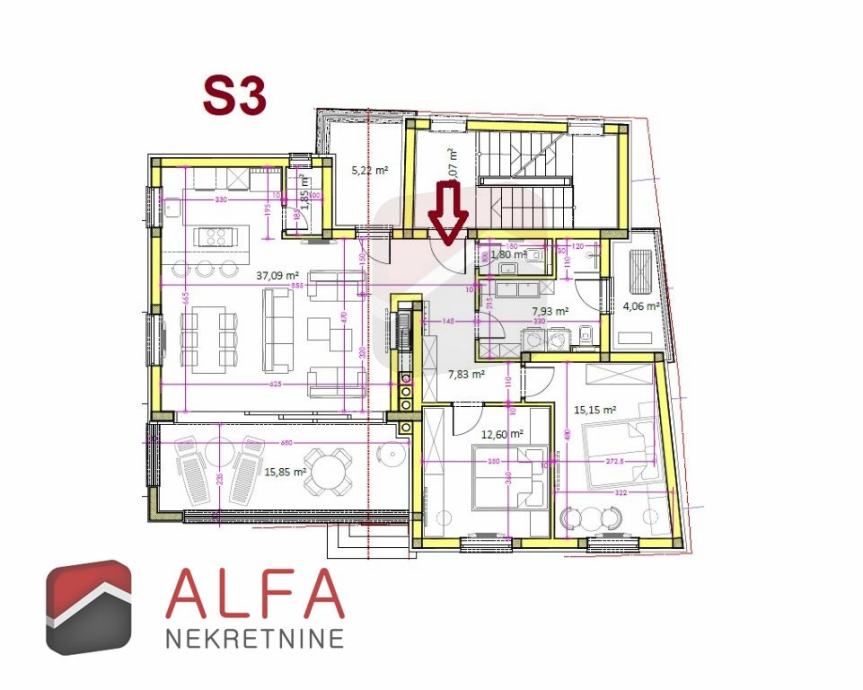 Stan S3 ima unutarnji stambeni prostor od 85,11 m2 + prednja natkrivena terasa (lođa) 15,40 m2 + manja terasa (lođa) od 4,06 m2 + stražnja terasa (lođa) od 5,18 m2 + dva parkirna mjesta od ukupno 30 m2. Sveukupno sa obračunskim koeficijentima stan ima ukupnu korisnu vrijednost površine od 109,59 m2.
