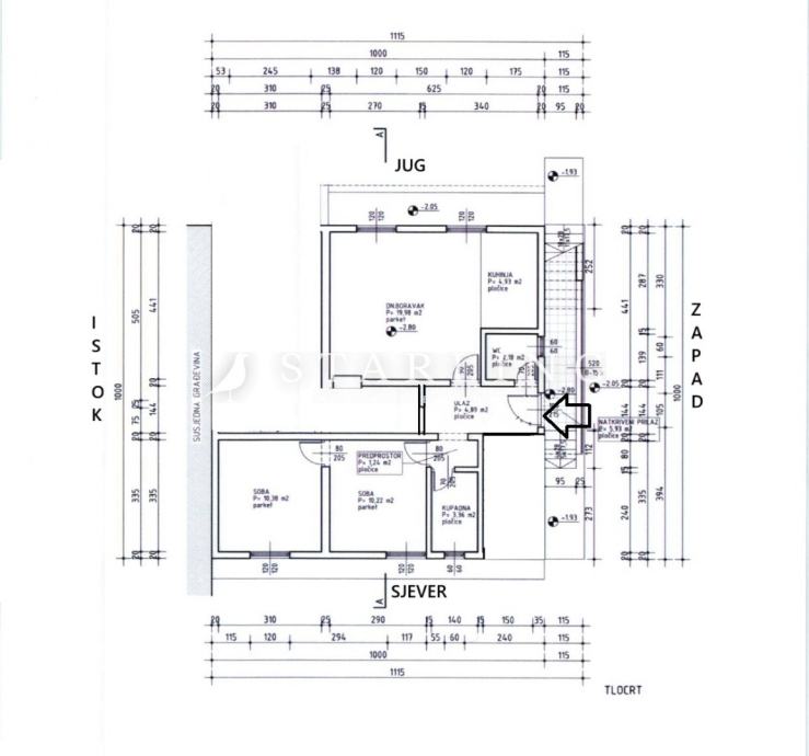 Stan se sastoji od dnevnog boravka s kuhinjom i blagovaonicom, 2 spavaće sobe, kupaonice s wc-om, odvojenog wc-a i hodnika.