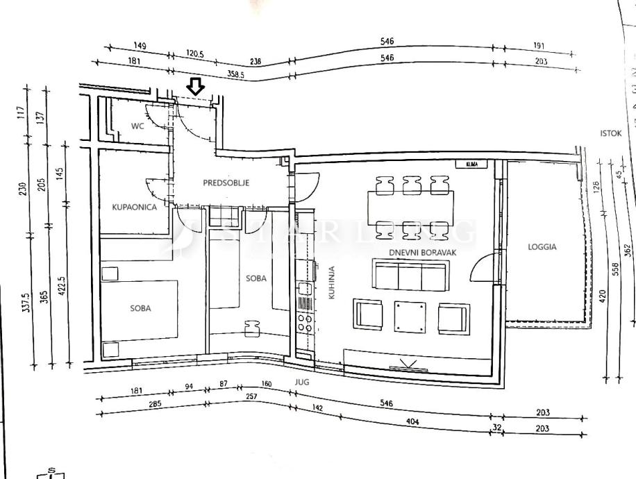 Stan se sastoji od open-space dnevnog boravka s blagovaonicom i kuhinjom, dvije spavaće sobe, kupaonice s wc-om, wc-a, hodnika i lođe.