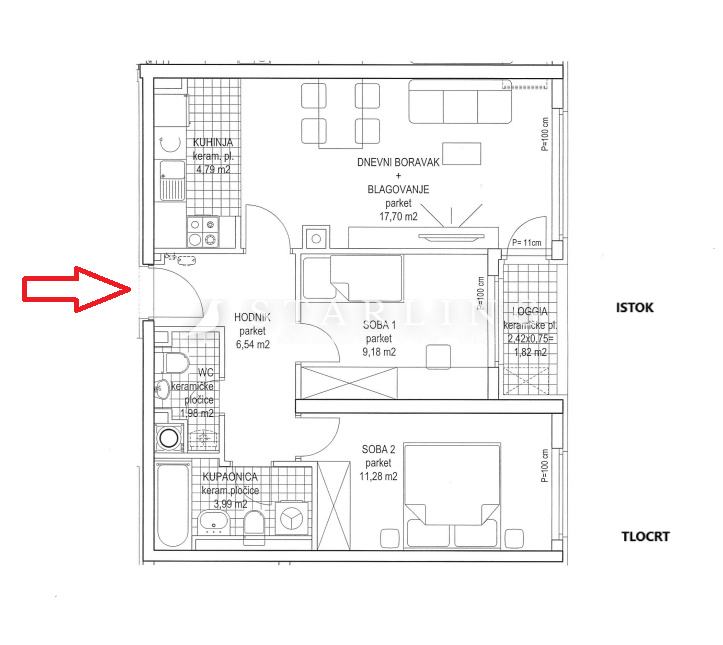 Stan se sastoji od dnevnog boravka s blagovaonicom, kuhinje, dvije spavaće sobe, kupaonice s wc-om, gostinjskog wc-a, hodnika i lođe.