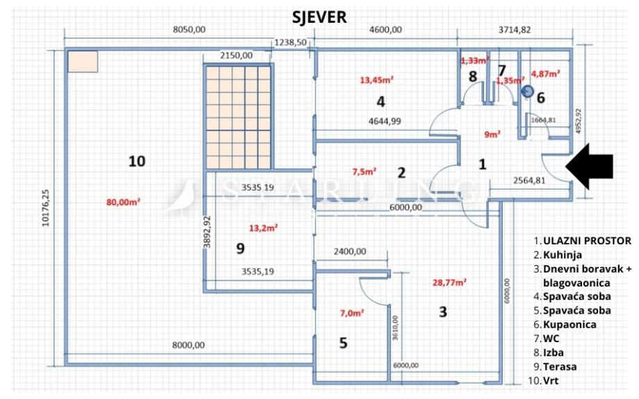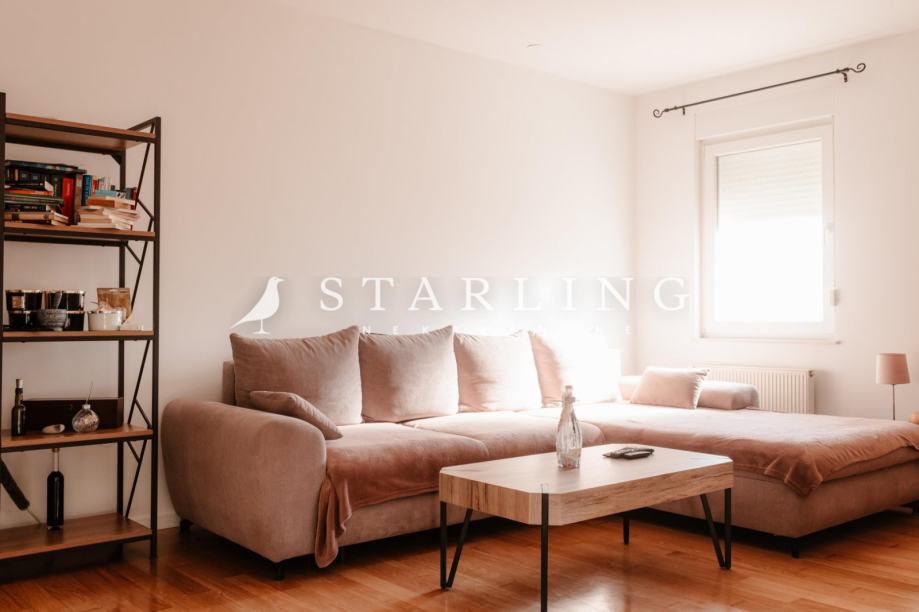 Stan se sastoji od prostranog dnevnog boravka s izlazom na terasu i vlastiti vrt površine 80 m2, blagovaonice, dvije spavaće sobe, kupaonice, WC-a, ostave i ulaznog prostora.