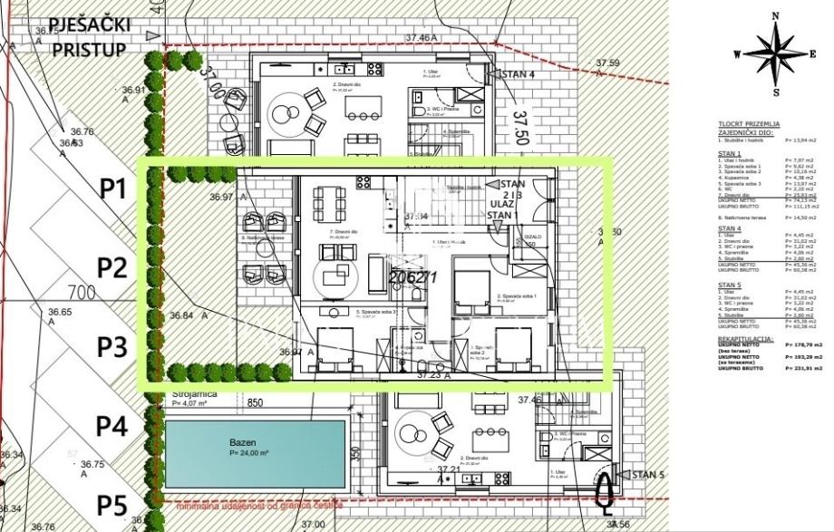 Smješten je u prizemlju te je ukupne površine cca 85 m2 a neto površine od 74 m2 sa natkrivenom terasom od 14 m2.