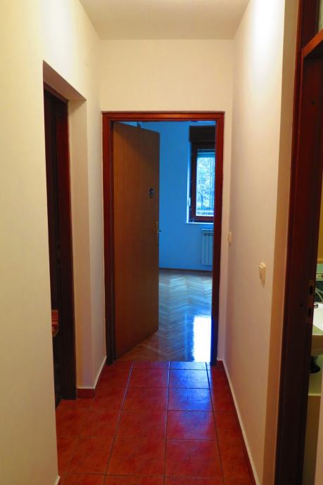 Iznajmljujemo stan od cca 45m2 s izlazom u vrt. Stan se nalazi u visokom prizemlju, parking ispred zgrade je besplatan, lokacija odlična. Stan raspolaže s dvije velike klime u obje prostorije, opremljenom kuhinjom (štednjak + perilica za suđe), te kupaonom s kadom i veš mašinom. Iz stana se kroz staklenu stijenu izlazi u loggiu iz koje se prolazi u vrt gdje možete u miru piti kavu ili roštiljati (roštilj na raspolaganju). Stan je obnovljen (parketi) u 12. mjesecu 2019. godine, a posljednje je farban (zidovi i stolarija, te loggia u 10. mjesecu 2025. Police na slikama su modularne i nisu na istim mjestima, mogu se namjestiti po želji.