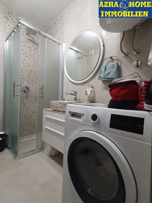 U okolici Poreča, 3km od mora, oko 1km od trgovačkih centara , nalazi se ovaj stan od 56,84 m2. Stan je smješten na 2.katu a čine ga: hodnik, dnevni boravak sa kuhinjskom nišom, dvije spavaće sobe od kojih jedna ima terasu i kupatilo.