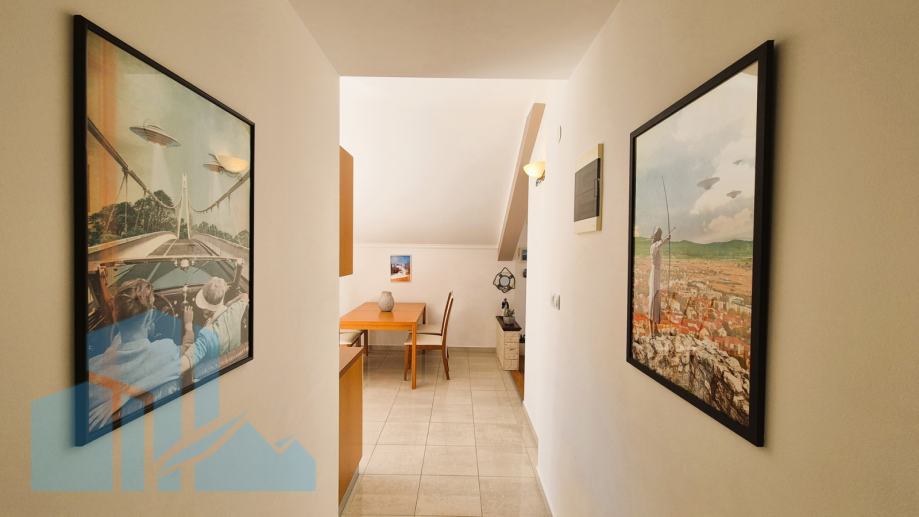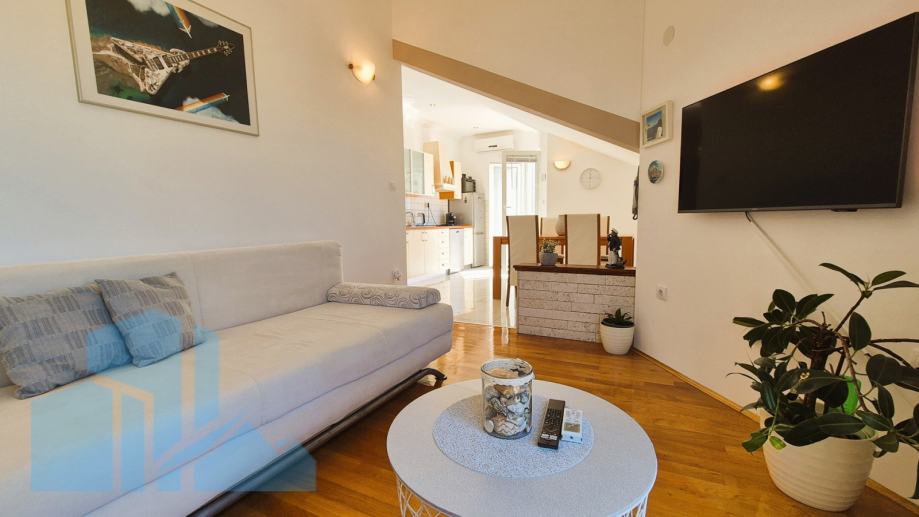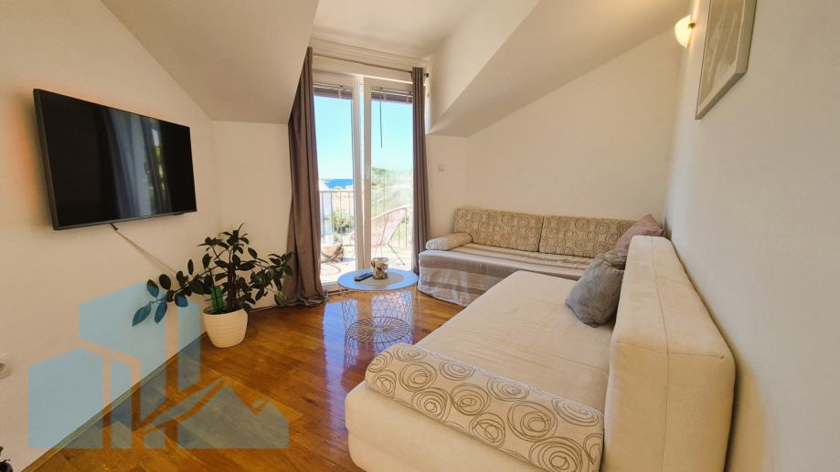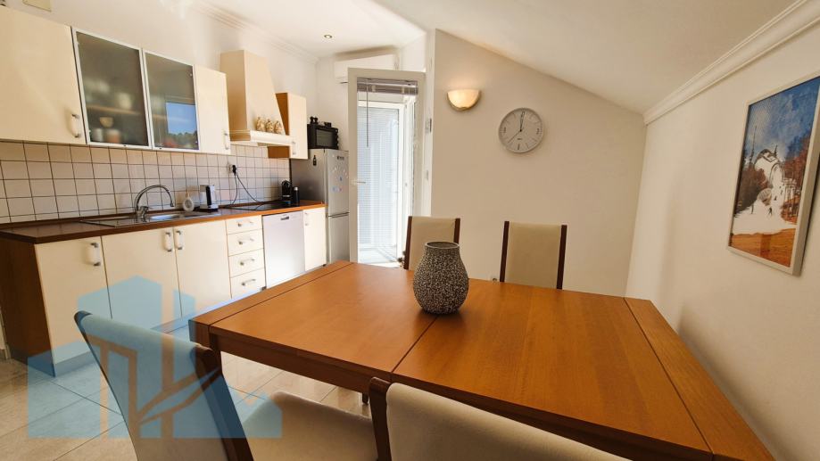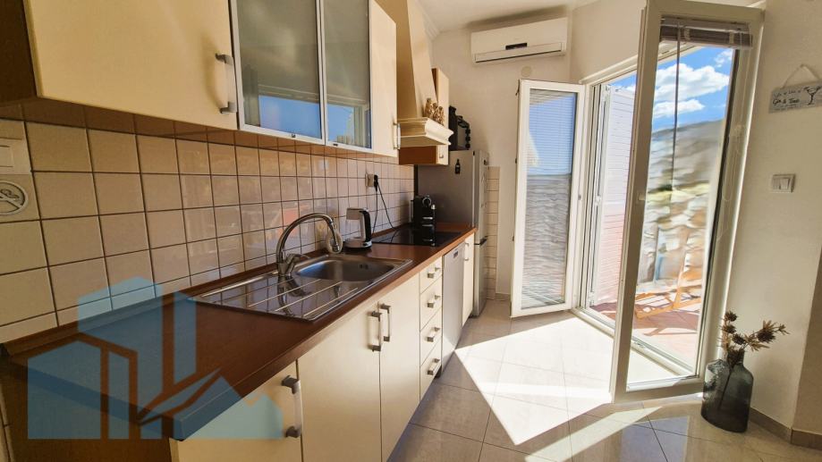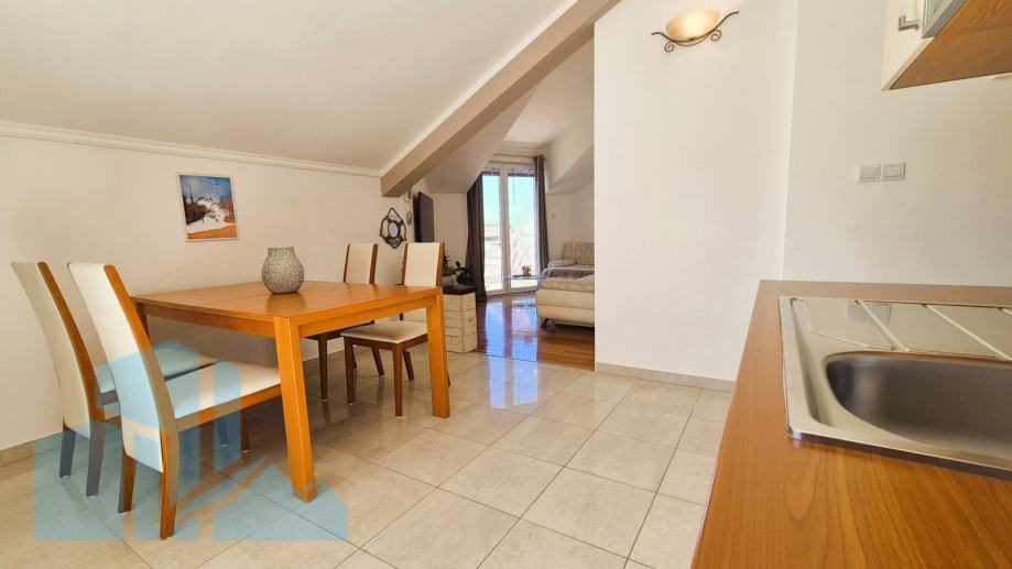Na prodaju je atraktivan stan u visokom potkrovlju stambene zgrade udaljene svega 100 metara od mora. Stan se nalazi u kvalitetno građenoj kući iz 2005. godine, a posljednja adaptacija izvršena je 2022. godine. Prodaje se sa garažom 19m2 i kompletno namješteno.