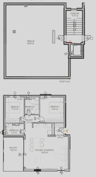 Sastoji se od prostranog otvorenog prostora kuhinje, blagovaonice i dnevnog boravka (36,45m2), dvije spavaće sobe (12,85m2 i 10,10m2), hodnika (5,59m2), dvije potpuno opremljene kupaonice (4,70m2 i 4,30m2), natkrivenog balkona (14,63m2) te iznimno prostrane krovne terase (89,99m2) s koje će se pružati neopisivo lijep pogled na more, otoke zadarskog ahipelaga te na poznati zadarski zalazak sunca.