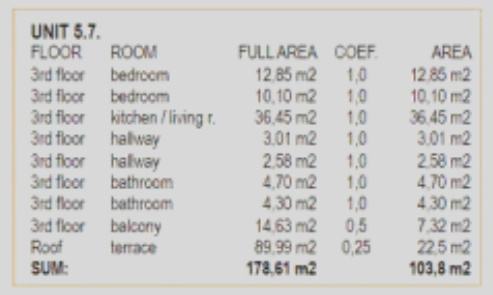 Penthouse 5.7. se nalazi na 3. katu stambene zgrade 5 te je je ukupne bruto površine 178,61m2, dok je njegova neto kvadratura - 103,8m2.