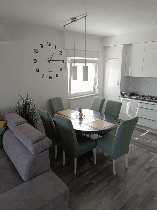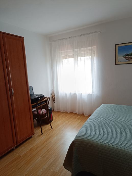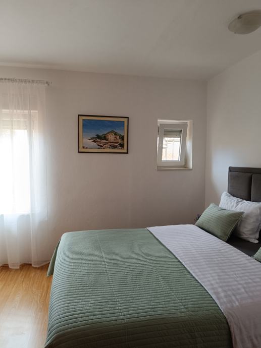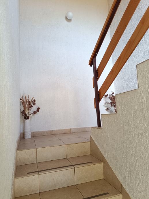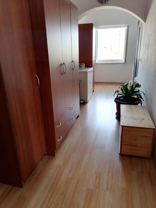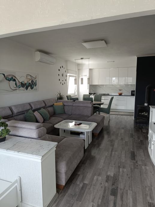 Prodaje se stan na prvom katu u privatnoj kući,(zaseban stan u prizemlju je prodan).Sastoji se od 3 spavaće sobe, prostranog hodnika, kupaone sa WC-om, predsoblja te otvorenog koncepta kuhinje, blagovaone i dnevnog boravka. Stan je renoviran 2021.godine i kompletno je namješten . Etažiran , ima zasebne priključke(struja,voda, kanalizacija) i uredno vlasništvo.Posjedujemo sve dozvole i elaborate Istom pripada i potkrovlje u roh-bau izvedbi površine 102,67m2 sa mogućnošću uređenja još jedne stambene jedinice.Ima svoje vlastito dvorište sa dva parkirna mjesta,te natkriveno stubište. Uz kuću se nalazi vrt, komin,konoba sa sanitarnim čvorom,prostorija za vešeraj +ostava.Stan je u neposrednoj blizini vrtića, ambulante,ljekarne i marketa. Udaljenost od mora svega 5 min vožnje.Agencije isključene! Moguć dogovor oko cijene!