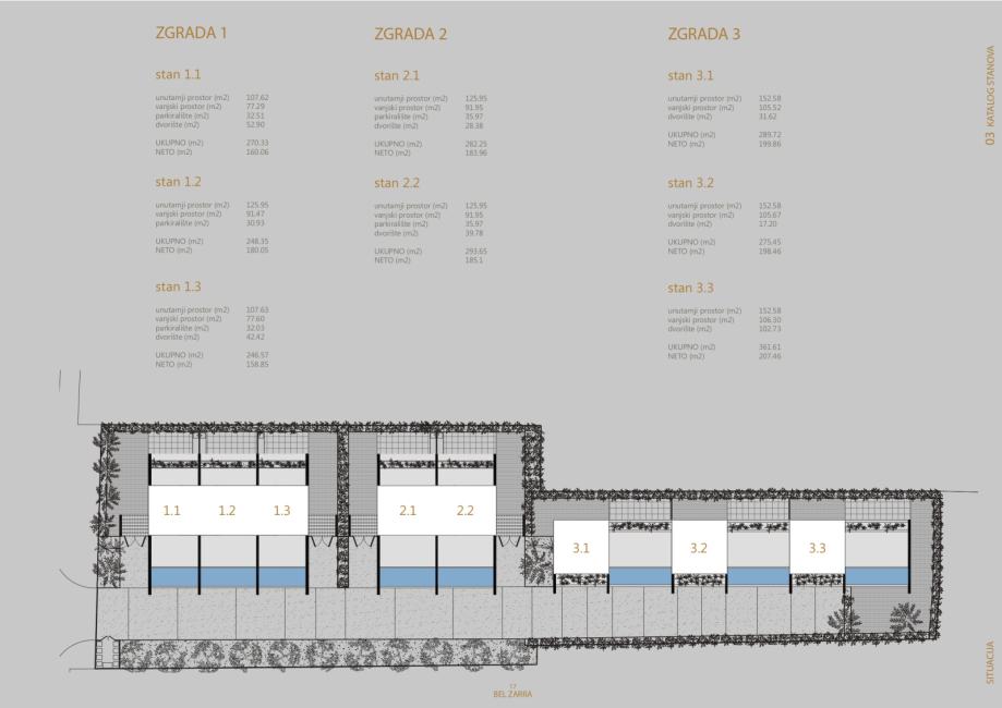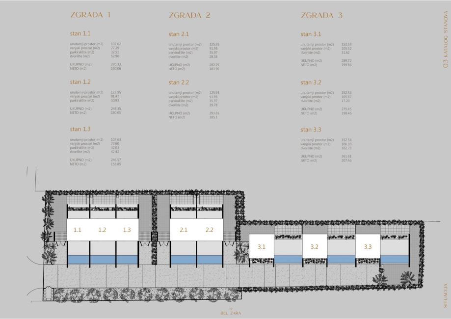Ovaj pažljivo osmišljeni projekt sastoji se od tri moderne zgrade s dvije nadzemne etaže, a stanovi su smješteni od prizemlja do drugog kata, nudeći širok raspon kvadratura i funkcionalnih rasporeda.