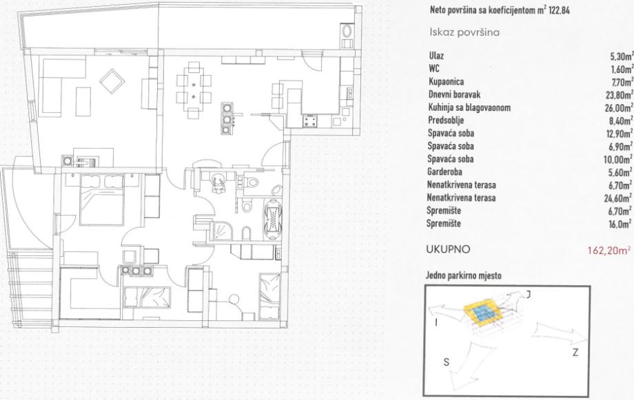 Stan u opisu nalazi se na zadnjem katu stambene zgrade izgrađene 2007. godine. Površina stana iznosi 116,03 m², a uključuje dodatno spremište u podrumu površine 6,81 m² i pripadajuće parkirno mjesto od 16,80 m². Zgrada je smještena u atraktivnom području Dikla u Zadru. Stan je etažiran i dio je suvlasničkog udjela zgrade. Prostor nudi funkcionalan raspored, kvalitetnu izgradnju i dodatan komfor zahvaljujući pripadajućim pomoćnim prostorima. Idealno za stanovanje ili kao investicija u turističke svrhe.