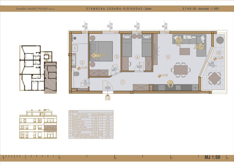 Stan S8 nalazi se na prvom katu. Sastoji se od hodnika i garderobe (7,92 m2), kupaonice (7,59 m2), dvije spavaće sobe (10,55 i 9,05 m2), kuhinje, dnevnog boravka i blagavaonice (24,35 m2) te loggie (1,84 m2) i natkrivene terase (2,45 m2).