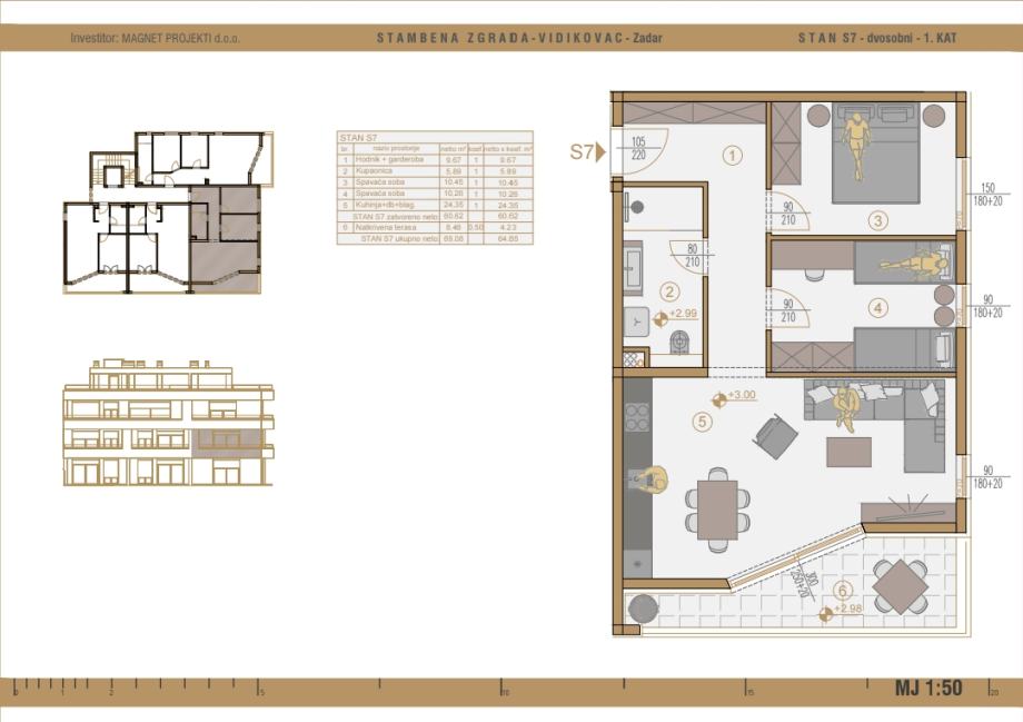 Stan S7 nalazi se na prvom katu. Sastoji se od hodnika i garderobe (9,67 m2), kupaonice (5,89 m2), dvije spavaće sobe (10,45 i 10,26 m2), kuhinje, dnevnog boravka i blagavaonice (24,35 m2) te natkrivene terase (4,23 m2).