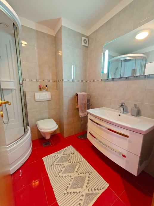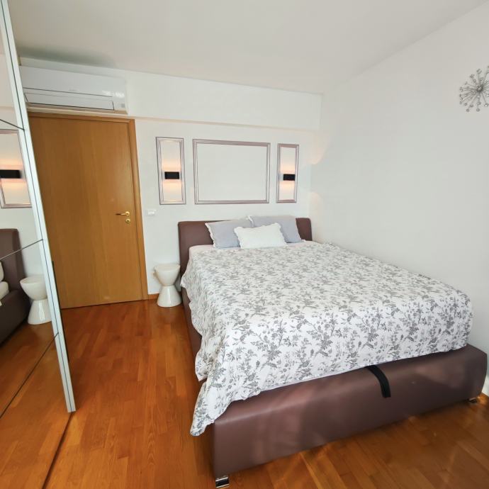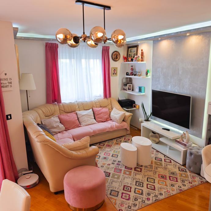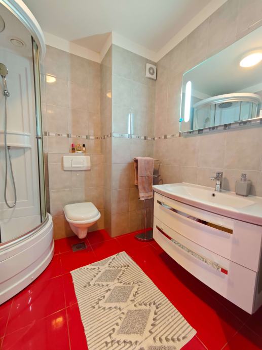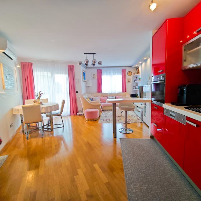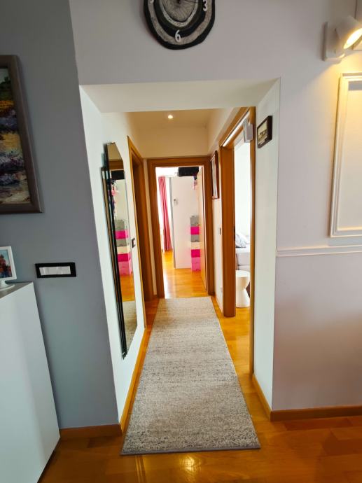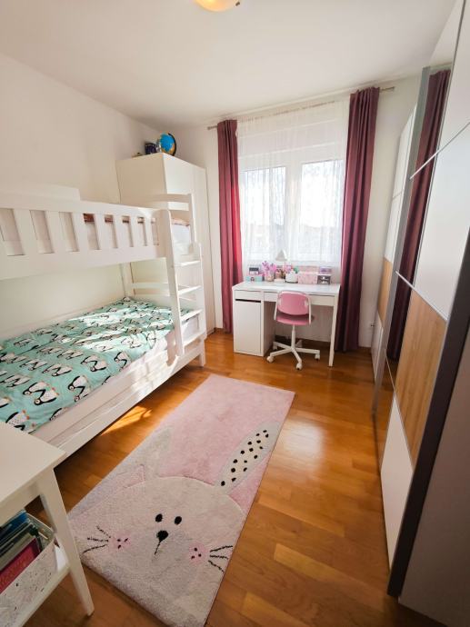 Podovi su obloženi kvalitetnim parketima, kuhinja je izrađena po mjeri te se prodaje potpuno namješten i sa svim pripadajućim aparatima.