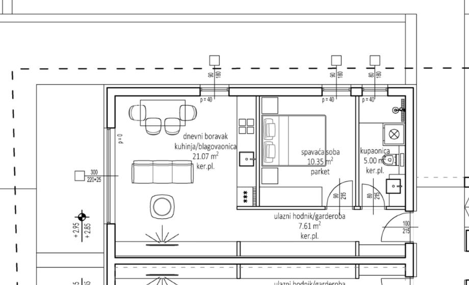 *Za vrijeme završnih radova kupci imaju mogućnost birati raspored prostorija, prema projektu stan može biti sa jednom ili sa dvije spavaće sobe, a oba tlocrta vidljiva su na slikama.