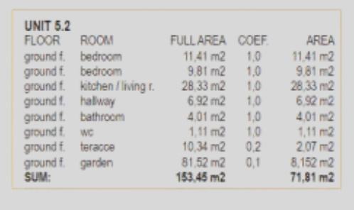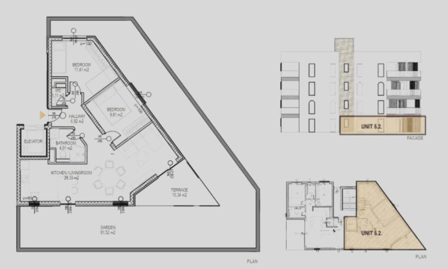 Stan 5.2. se nalazi na prizemlju stambene zgrade 5 te je je ukupne bruto površine 153,45m2, dok je njegova neto kvadratura - 71,81m2.