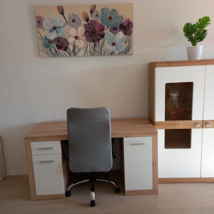 Raspored stana: hodnik (veći ugradbeni ormar + dodatni ormar samostojeći), kuhinja (sa svim aparatima i frižiderom, perilica suđa + mirkovalna), blagovaonica (kvalitetni stol sa staklom i 6 stolica), veliki dnevni boravak (kutna sjedeća garnitura, manji club stolić, veći regal s tv, moderni veći uredski radni stol u boji hrasta s uredskom stolicom), veća spavaća soba (s velikim kliznim ormarom, bračnim krevetom i 2 noćna ormarića), dodatna spavaća soba (s dva odvojena kreveta, tabure, veliki ormar klizni, radni stol + uredska stolica), veća kupaonica s wc-om (veš mašina + sušilica + Ariston moderni bojler), velika natkrivena balkonska lođa+ tenda (ratan balkonske stolice + club stolić), veće spremište u prizemlju zgrade od 4m2, te komforno parkirno mjesto u podzemnoj garaži.