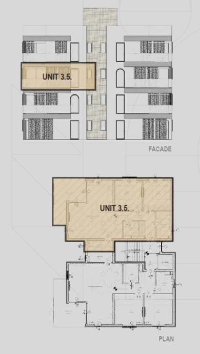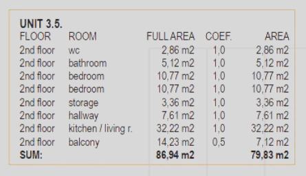 Stan 3.5. se nalazi na 2. katu stambene zgrade 3 te je je ukupne bruto površine 86,94m2, dok je njegova neto kvadratura - 79,83m2.