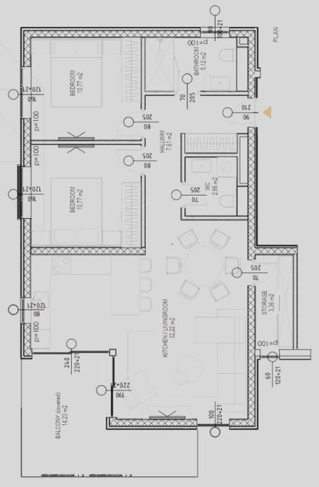 Sastoji se od prostranog otvorenog prostora kuhinje, blagovaonice i dnevnog boravka (32,22m2), dvije spavaće sobe (10,77m2 i 10,77m2), hodnika (7,61m2), potpuno opremljene kupaonice (5,12m2), WC-a (2,86m2), natkrivenog balkona (14,23m2).