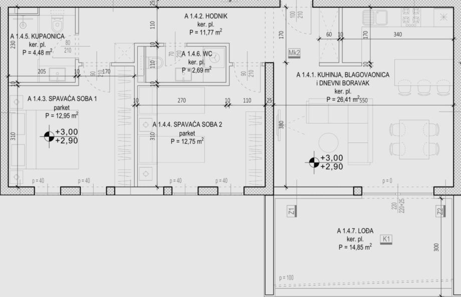 Dvosobni stan na 1.katu neto površine 85,90 m2 koji se sastoji od open space dnevnog boravka, hodnika, kupaonice, WC-a, dvije spavaće sobe te loggie. Neto korisna površina ovog stana iznosi 82,19 m2.