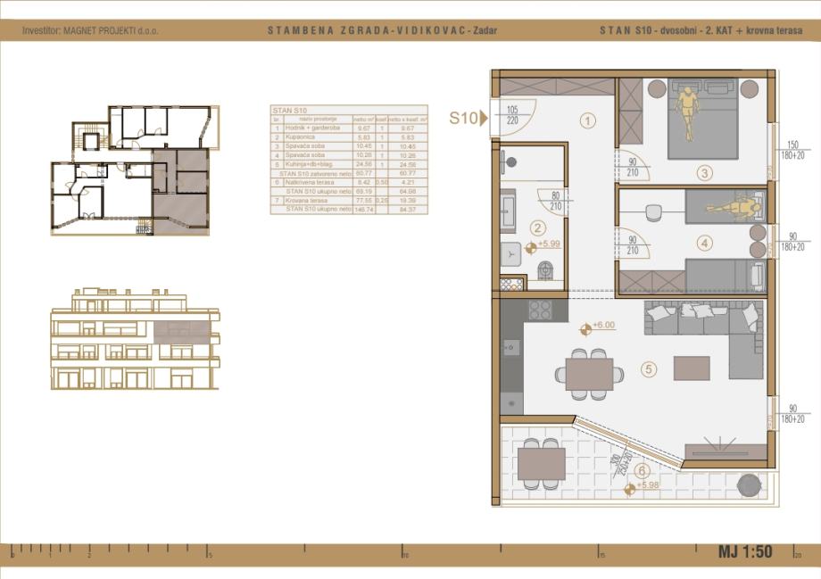 Stan S10 nalazi se na drugom katu. Sastoji se od hodnika i garderobe (9,67 m2), kupaonice (5,83 m2), dvije spavaće sobe (10,45 i 10,26 m2), kuhinje, dnevnog boravka i blagavaonice (24,56 m2), natkrivene terase (4,21 m2) te krovne terase (19,39 m2).