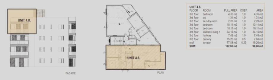 Penthouse 4.8. se nalazi na 3. katu stambene zgrade 4 te je je ukupne bruto površine 162,05m2, dok je njegova neto kvadratura - 96,68m2.