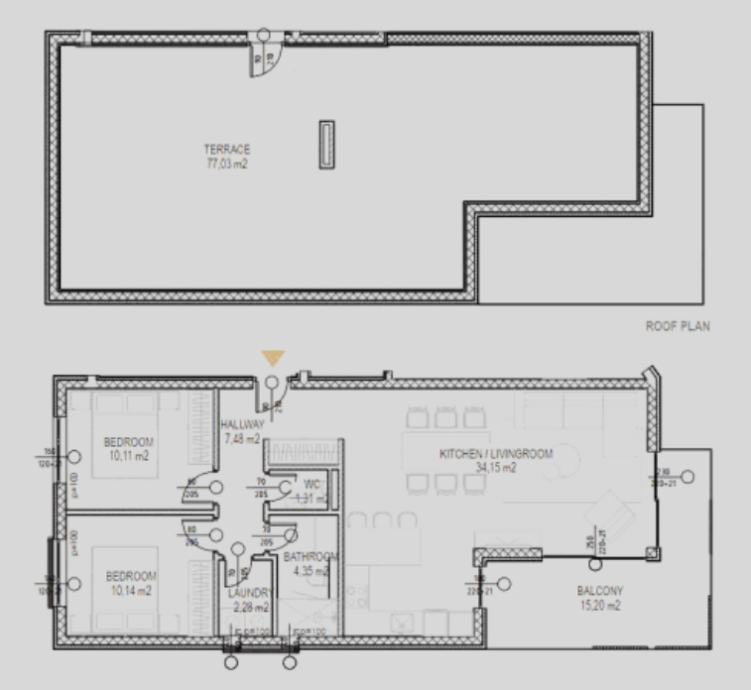 Sastoji se od prostranog otvorenog prostora kuhinje, blagovaonice i dnevnog boravka (34,15m2), dvije spavaće sobe (10,14m2 i 10,11m2), hodnika (7,48m2), dvije potpuno opremljene kupaonice (4,35m2) WC-a (1,31m2), natkrivenog balkona (15,20m2) te iznimno prostrane krovne terase (77,03m2) s koje će se pružati neopisivo lijep pogled na more, otoke zadarskog ahipelaga te na poznati zadarski zalazak sunca.