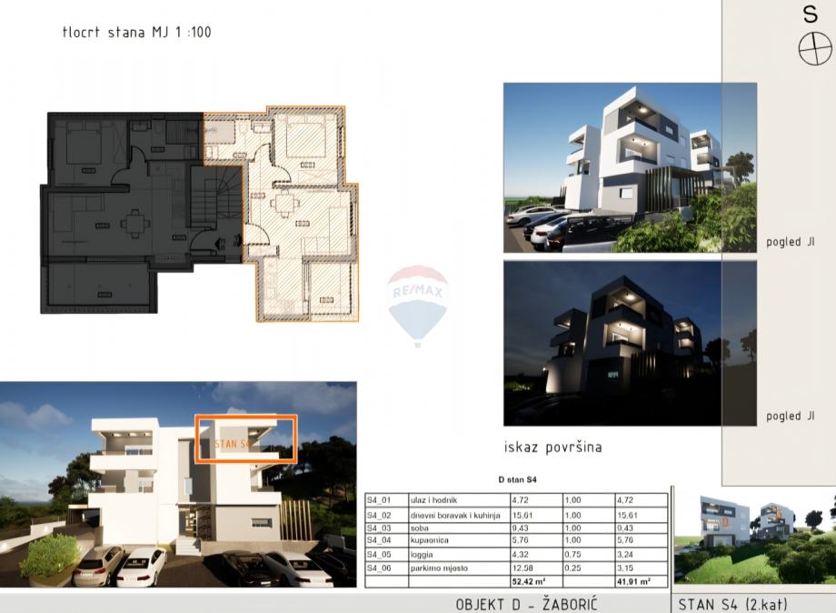 Stan S4 nalazi se na drugom katu novogradnje u Žaboriću. Stan površine 41.91 m2 u manjoj zgradi s ukupno 6 stanova sastoji se od kuhinje spojene s blagovaonicom i dnevnim boravkom, kupaonice, spavaće sobe i loggie.