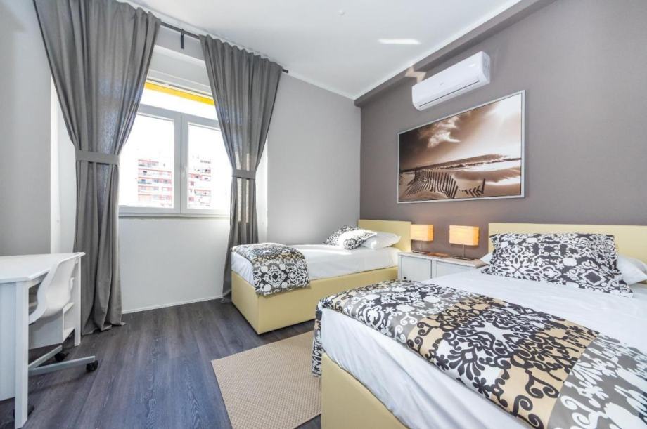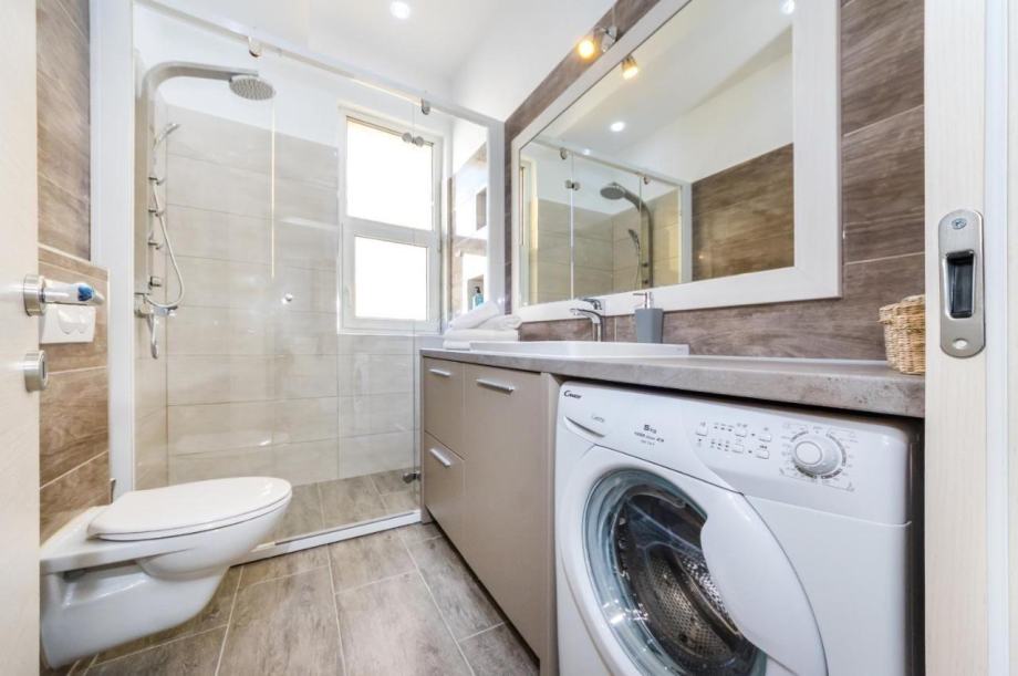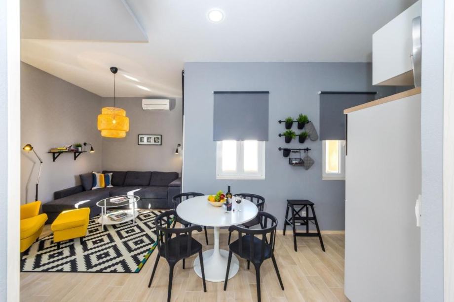 Smješten na četvrtom katu zgrade opremljene liftom, ovaj stan nudi izvanredan pogled na more, kao i na staru jezgru grada. Zgrada je redovito održavana i uređena, a ima i zajedničku krovnu terasu s kaminom, koja dodatno obogaćuje prostor. Stan se sastoji od dvije spavaće sobe, kuhinje s blagovaonicom, dnevnog boravka, WC-a s kupaonicom, te lođe koja je opremljena aluminijskim kliznim stijenama. Svaka spavaća soba ima unutarnju jedinicu za hlađenje/grijanje, dok se jedna nalazi i u dnevnom boravku, što omogućuje ugodnu temperaturu u cijelom stanu. Stan ima i mogućnost grijanja na kruta goriva.