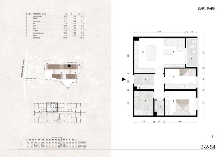 Projekt KARL PARK je isključivo stambene namjene formiran je od 3 nadzemna volumena sa 4 zasebna ulaza oznake A, B, C i D međusobno povezana etažom podzemne garaže .