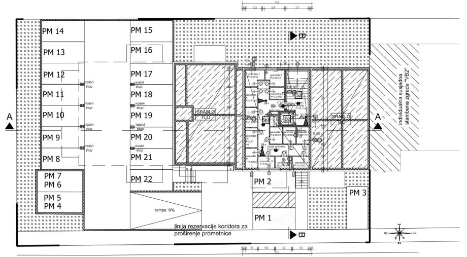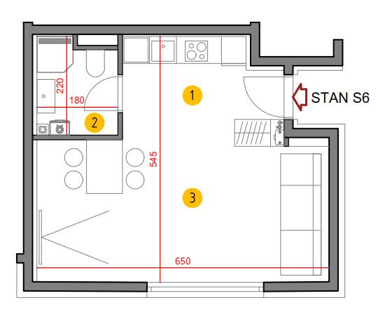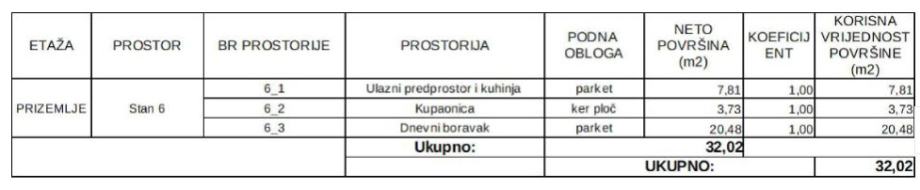 Stan S6 nalazi se u prizemlju. Njegova površina iznosi 32,02 m2. Uz stan dolazi pripadajuće parkirno mjesto PM9 (12,50 m2, koef. 0,25).