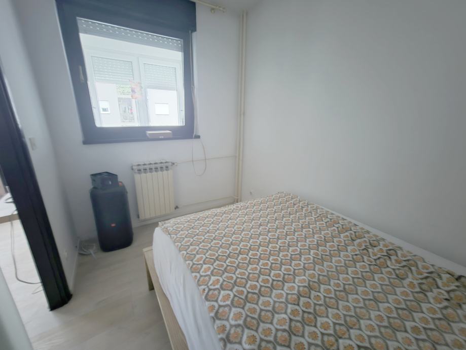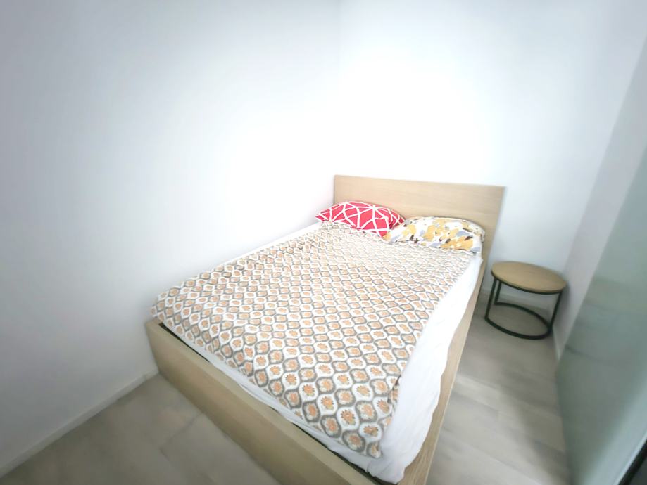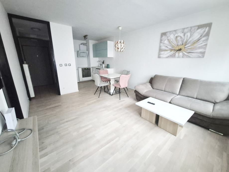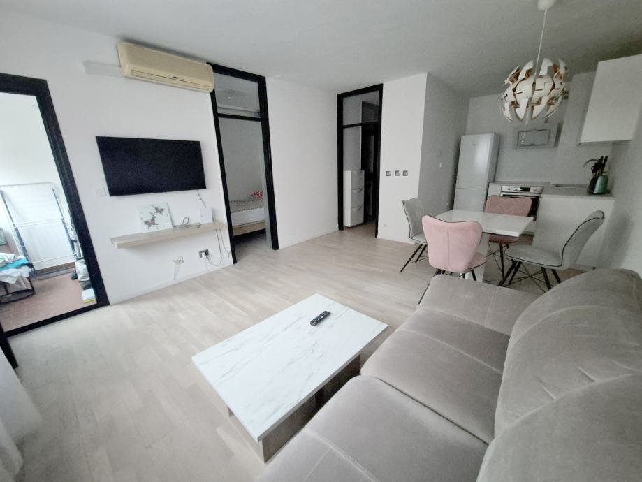 Stan se sastoji od klimatiziranog dnevnog boravka sa blagaonom te izlaskom na balkon, kuhinjom sa perilicom posuđa, spavačom sobom sa ormarom i kupatilom sa WCom.