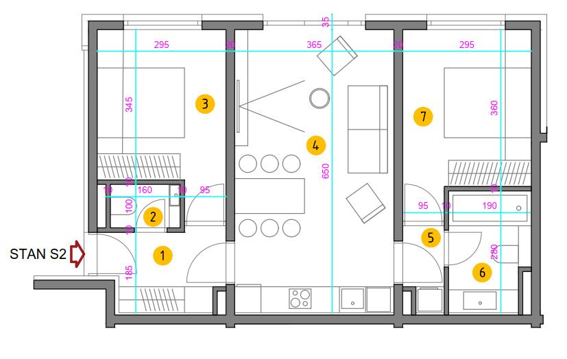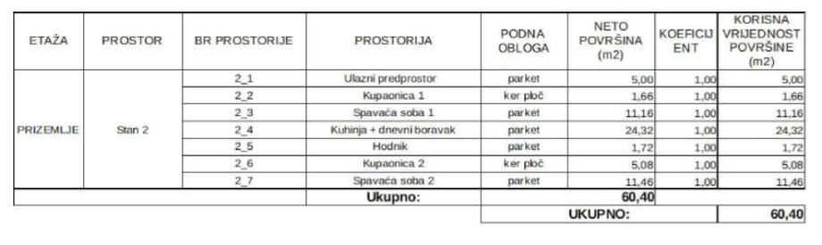 Stan S2 nalazi se u prizemlju. Njegova površina iznosi 60,40 m2. Uz stan dolazi pripadajuće parkirno mjesto PM 2 (12,50 m2, koef. 0,25).