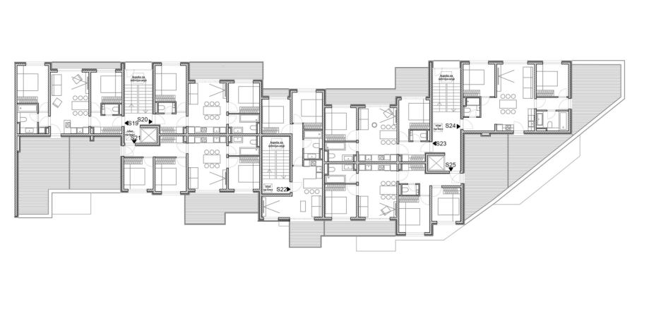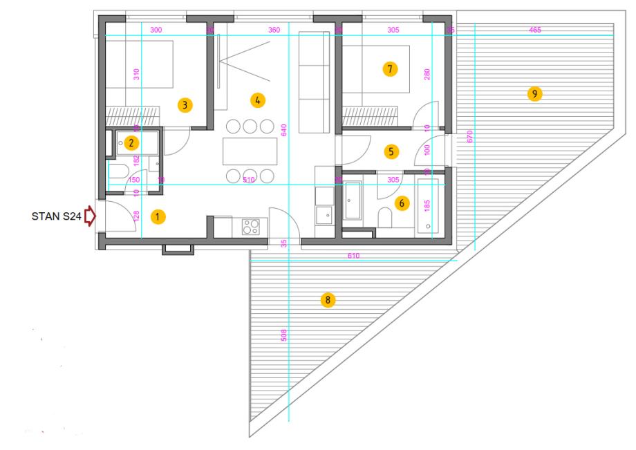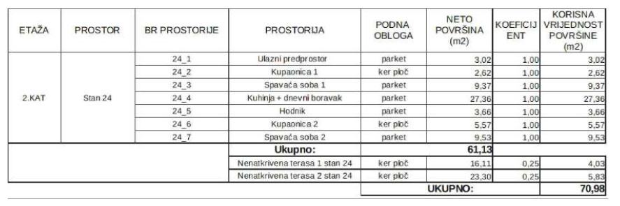 Stan S24 nalazi se na 2. katu. Njegova površina iznosi 70,98 m2. Uz stan dolazi pripadajuće parkirno mjesto PM 22 (12,50 m2, koef. 0,25).