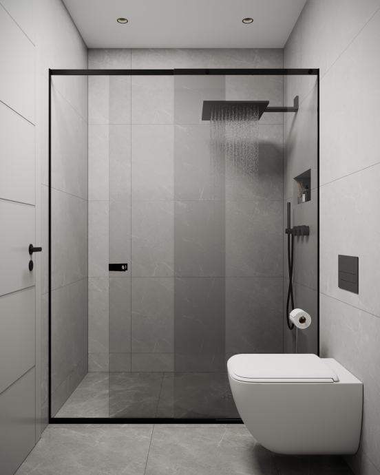 * Potpuno opremeljena kupaonica, walk-in tuš kabina, umivaonik sa slavinom, ormarić i ogledalo
