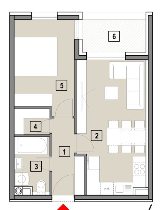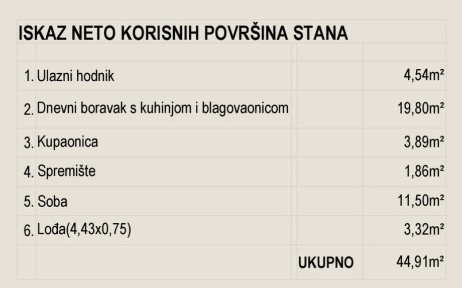 Stan se sastoji od openspace dnevnog boravka, kuhinje i blagovaonice, kupaonice, ostave i jedne spavaće sobe. Stan ima svoje parkirno mjesto.