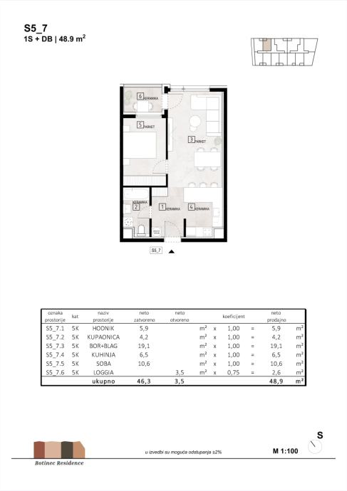 Stan S 5_7 nalazi se na petom katu površine 49,90 m2, a sastoji se od hodnika, kupaonice, kuhinje, boravka s blagavaonicom, spavaće sobe i loggie.