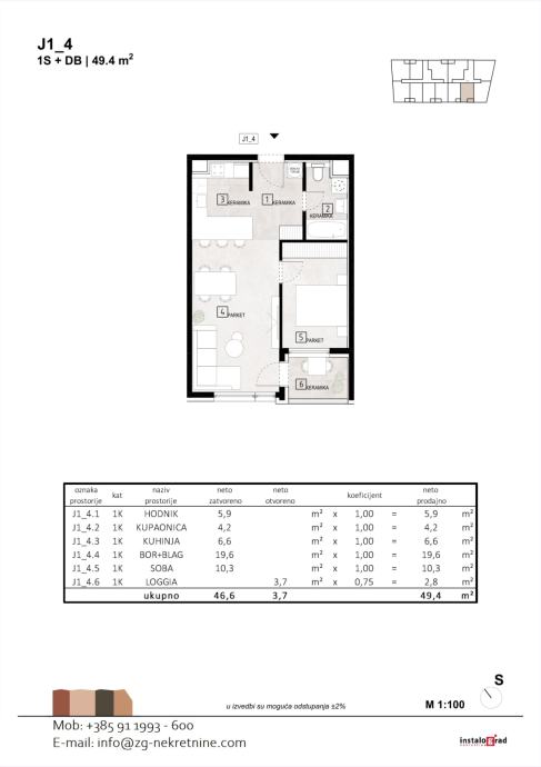 Stan J 1_4 nalazi se na prvom katu površine 49,40 m2, a sastoji se od hodnika, kupaonice, kuhinje, boravka s blagovaonicom, spavaće sobe i loggie.