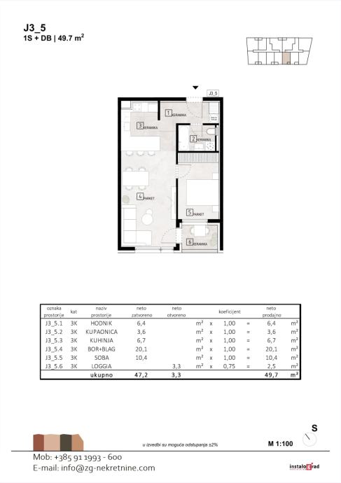 Stan J 3_5 nalazi se na trećem katu površine 49,70 m2, a sastoji se od hodnika, kupaonice, kuhinje, boravka s blagovaonicom, spavaće sobe i loggie.